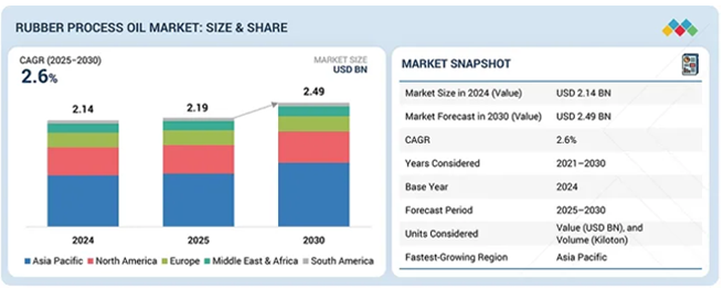 세계의 고무 가공유 시장 규모는 예측 기간 중에 CAGR 2.6%로 성장하여 2025년 21억 9,000만 달러에서 2030년에는 24억 9,000만 달러에 이를 전망입니다. 고무 가공유는 천연 고무 및 합성 고무 화합물의 가공 특성과 성능 특성을 향상시키는 데 중요한 역할을 합니다.